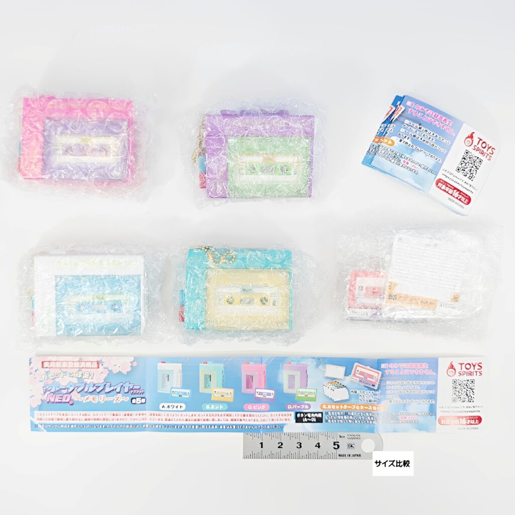 約5cmのミニサイズながら、実際にカセットへの録音・再生が可能です。さらに、録音したカセットは他の本体でも再生できる本物志向の仕様。全種ボールチェーン付きのパステルカラー全5種、レトロかわいい注目のアイテムです!