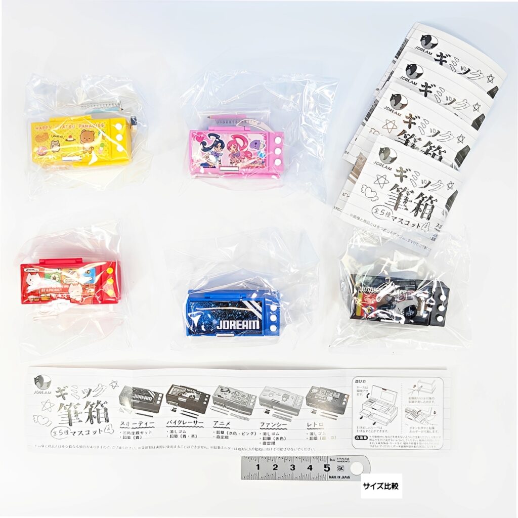 消しゴムや定規などのミニ文房具も付属し、全種揃えたくなるクオリティ。アニメ風やレトロ、格好いいバイクレーサーなどデザインも多彩です。デスクに飾れば、あの頃のワクワク感が蘇ること間違いなしです!
