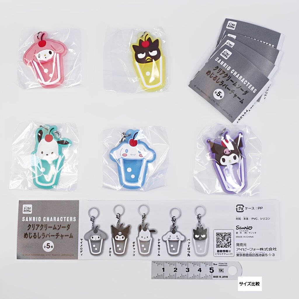 傘の持ち手やペットボトルに付ければ、自分だけの目印として大活躍します。ラインナップは、マイメロディ、クロミ、ポチャッコ、シナモロール、バッドばつ丸の全5種。ぜひお気に入りのキャラと一緒に、お出かけを楽しんでくださいね。