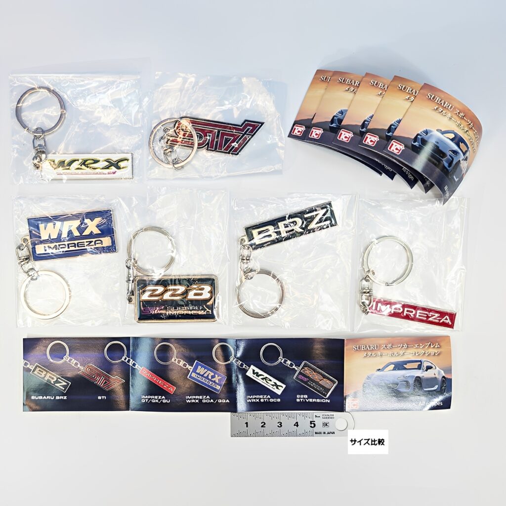 BRZやSTI、WRXロゴに加え、伝説の22B、歴代インプレッサなどラインナップ。ダイキャスト製(亜鉛合金)のリアルな質感と、約55mmの存在感あるサイズが所有欲を満たします。愛車の鍵やバッグのアクセントに最適な逸品です。