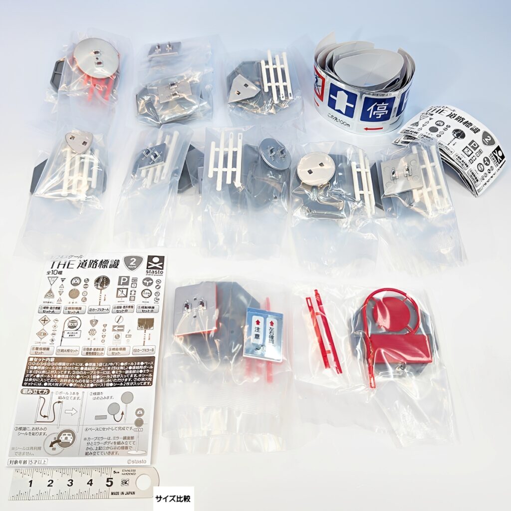 おなじみの規制標識から消火栓、カーブミラーまで幅広くラインナップ。デスク周りのアクセントとしてはもちろん、プラモデルやミニカー、鉄道模型の情景小物、さらにはジオラマ撮影のスパイスとしても最適な逸品です。