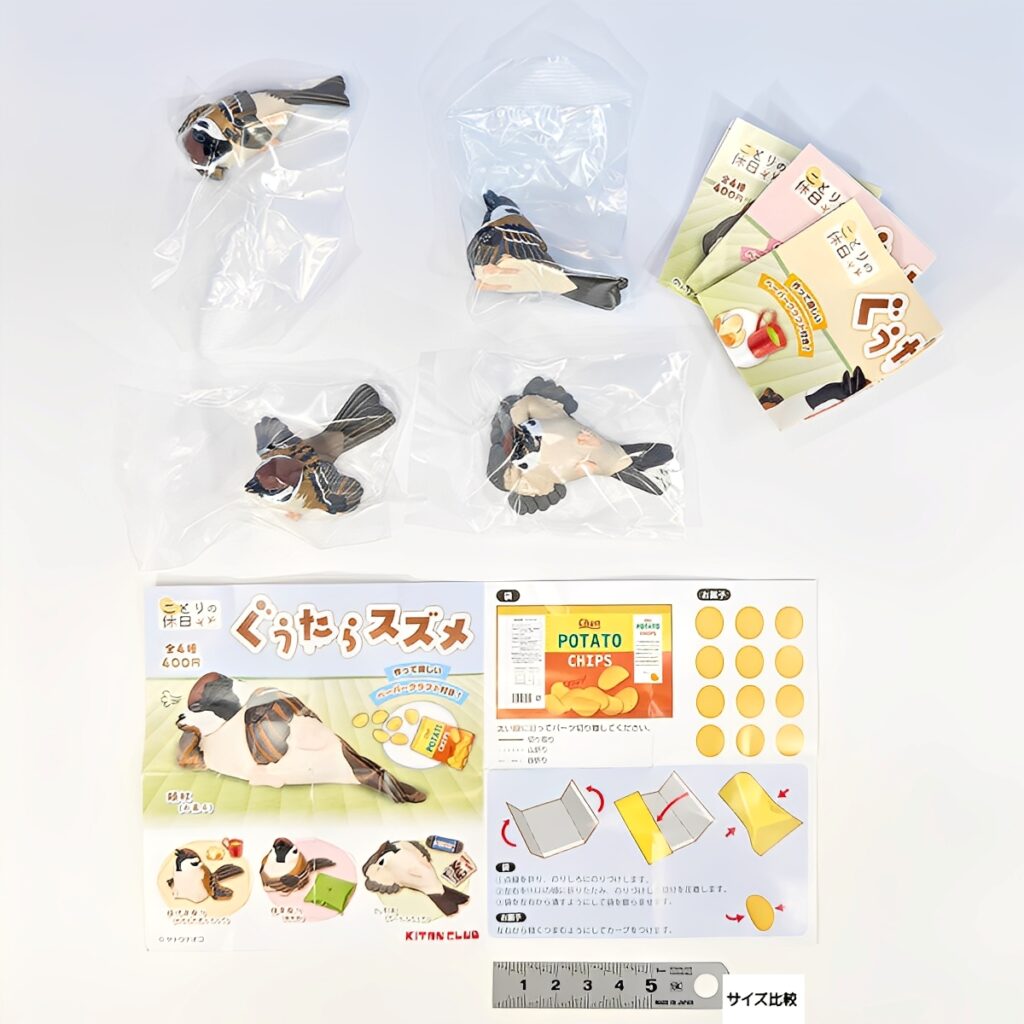 ただただ家でぐうたらするスズメたちは、みかんの皮やゲーム、漫画など、人間味あふれるポージングが魅力。付属のペーパークラフトを使えば、さらに「ぐうたら」で可愛い姿に!