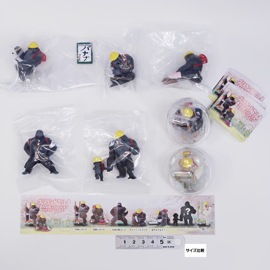 ランドセルを背負ったシュールで肉体美あふれるゴリラたちが、芋掘りや習字、応援団長など個性豊かな姿でラインナップ。飾るだけで笑顔になれる、コレクター必見のおすすめアイテムです。