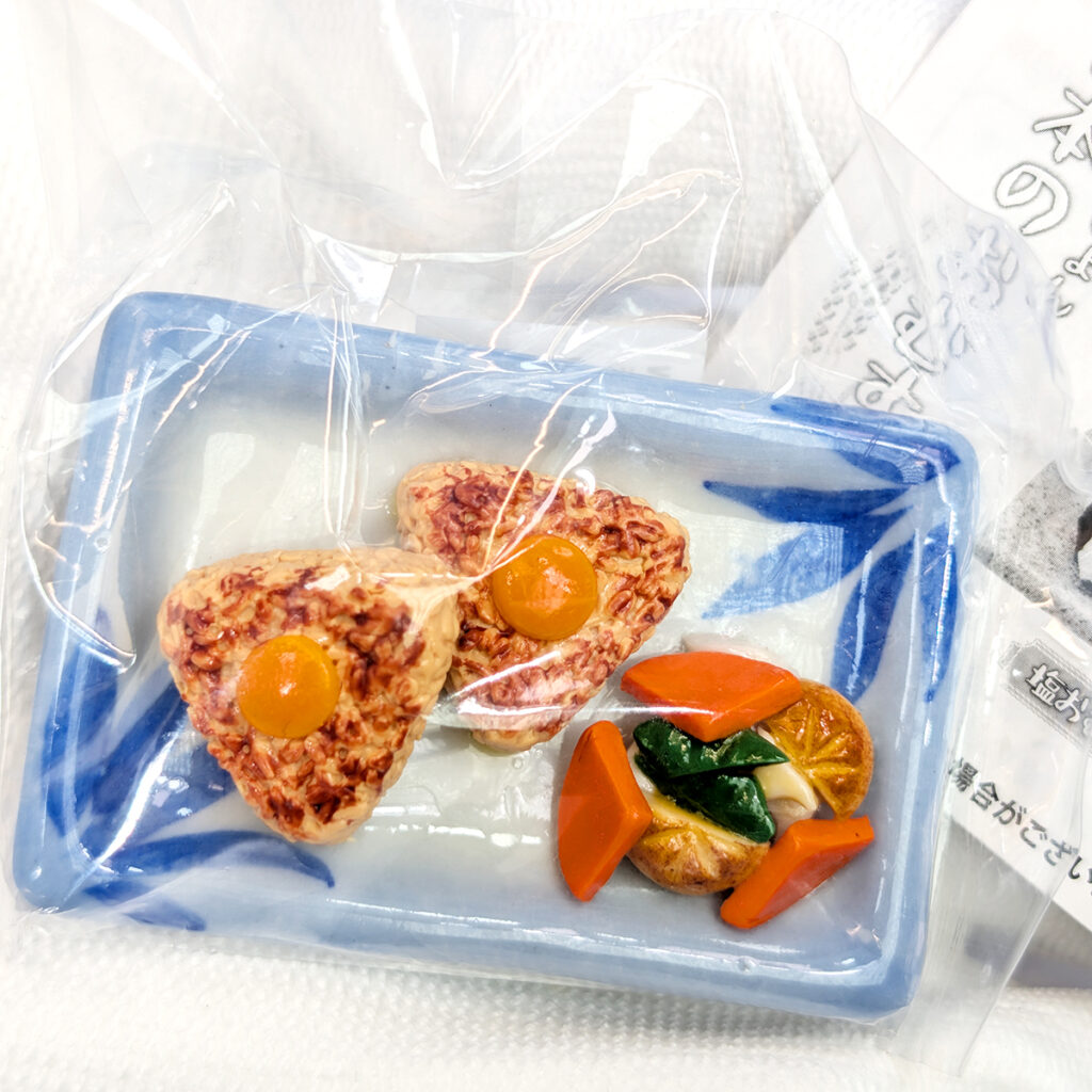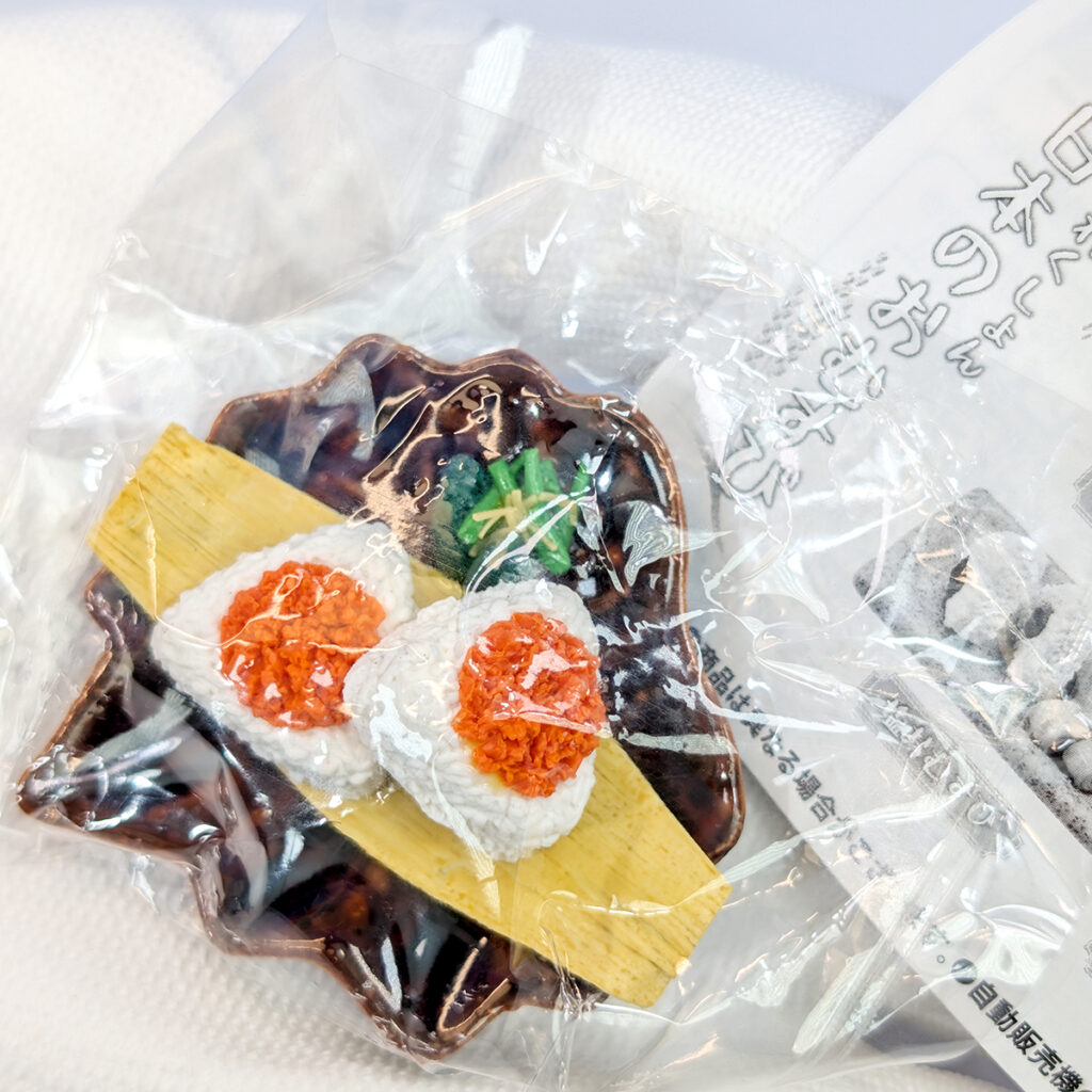 約5cmのちょうど良い手のひらサイズで、米粒の質感や焼き色までリアルに表現、種類ごとにお皿が違うのがポイントで細部へのこだわりが光る、集めて飾りたくなる逸品です。