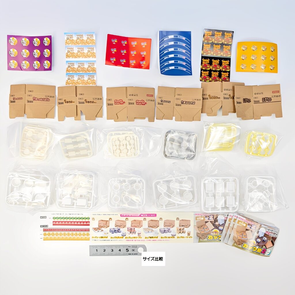 段ボール1箱にミニチュアカップ12個、乾麺、シールが付属。ソース焼きそばやきつねうどんなど、リアルな造形でフィギュアの小物やドールハウスのストックに最適です。たくさん集めて、圧巻の「箱積み」を楽しめます。